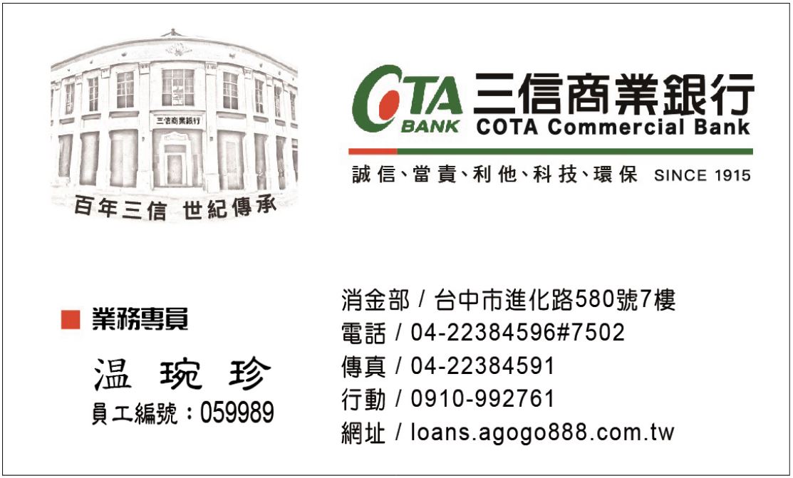我是三信商銀信貸五組專員: 陳 曉 儀 服務專線:0915-251314 |