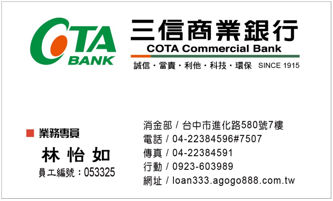 我是三信商業銀行信貸專員~林怡如 在金融業服務十多年來,一向秉持著【三信商業銀行】的精神~活潑‧創新‧親切‧服務~來服務每一位客戶,很高興能幫大家規劃理財,也得到大家寶貴的指教,受益良多。 三信商銀目前提供醫師、會計師最高200萬免保人的信貸方案;另有建築師、律師、公務人員、醫護人員、教師、金融同業信用貸款, 請洽三信商銀信貸專員:林怡如:0923603989 ☎專線:04-37016733或04-22384596轉7507 (若無人接聽,請改撥手機,謝謝)